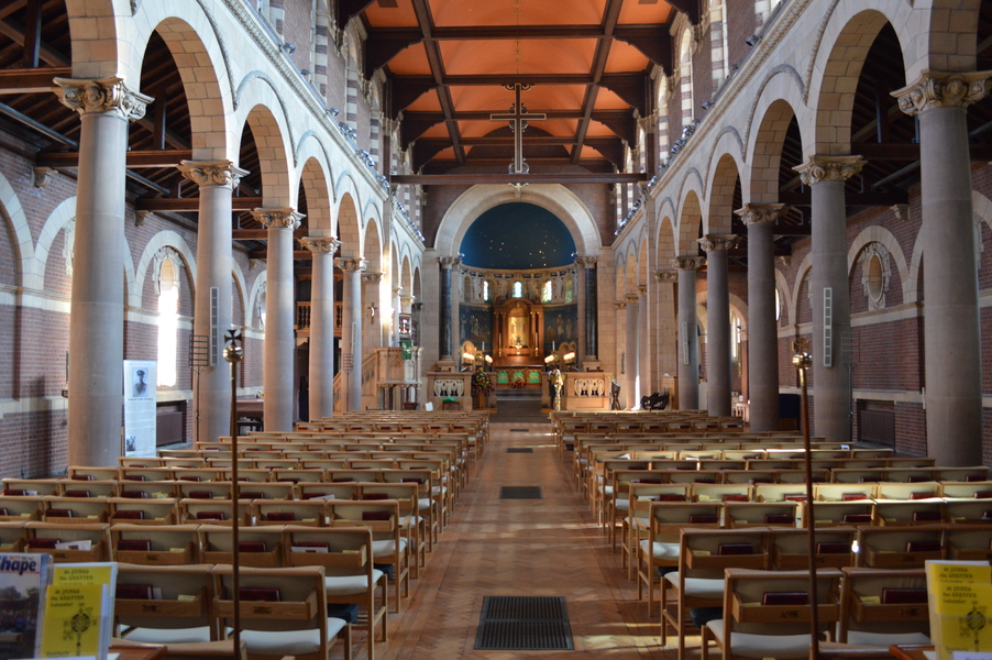 The building materials used in the church are mainly brick and terra cotta, but stone is used for the pillars, on the west front, and in a number of other places.