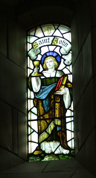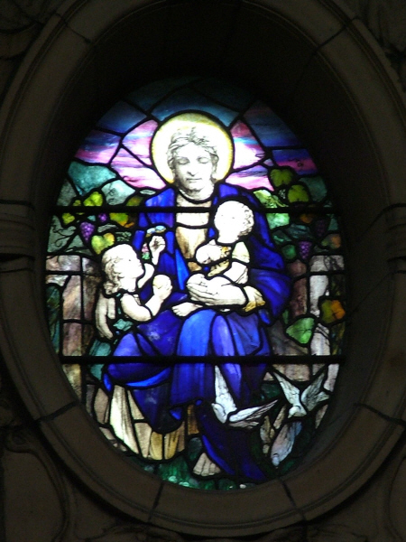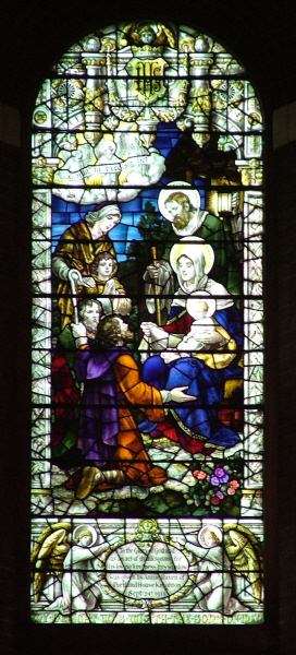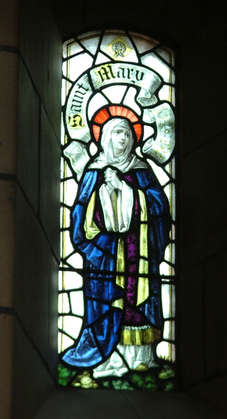 The west-end stained-glass window representing the Blessed Virgin presenting the Holy Child to the Shepherds was given by Annie Raven, Portland House, Knighton, the grandmother of Simon Raven the writer. It was designed by the same artist who designed the windows in the apse of the Lady Chapel, Mr R. J. Newberry of London.