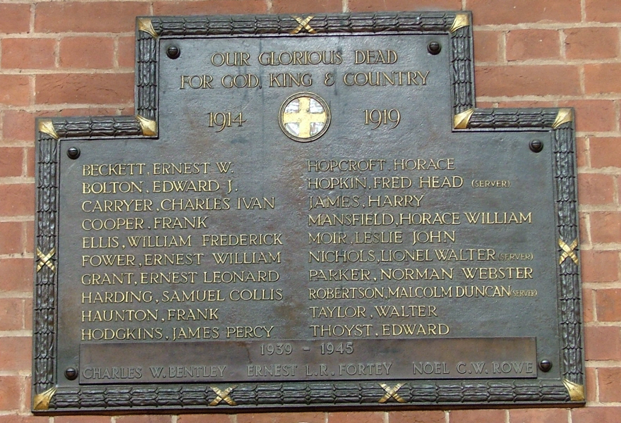 On a pillar behind the pulpit you can see a plaque relating to the installation of the organ as "...a thank offering for the restoration of peace after the European War 1914-1919..."
