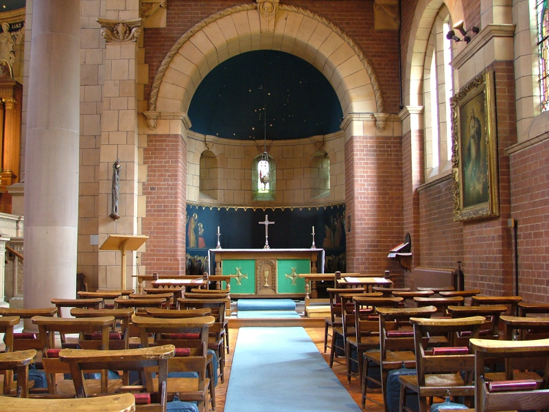 In front of you is the raised choir. Along the front is a series of terra cotta angels against a blue-glazed background. This blue Majolica work, as it is called, was copied by Henry Langton Goddard from examples he had seen in Italy. Goddard said that he had been influenced by the work of Della Robia, an Italian fourteenth-century artist whose work he had seen in the church of San Miniato in Florence. Look closely at the quality of the work on the surround to the choir; the angels and the upright panels of terra cotta show strong similarities with Santa Maria dei Miracoli in Venice.