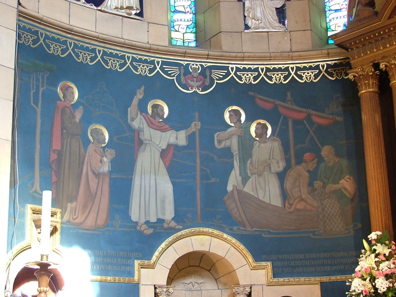 The mural below depicts the call and the martyrdom of James. It was completed in 1938 by Diana Goddard, a gift of Anne Raven, Wynnstead, Knighton Grange Road. You will find a plaque commemorating this gift under the organ.