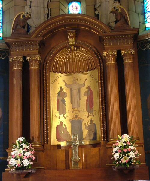 Immediately in front of you at the back of the apse is a wooden reredos. It was designed by Henry Goddard and made by Messers Henry Herbert & Sons, the builders who built St James. The carving was the work of Mr J. H. Morcom and the carved angels, gilding and painting of the central panel, a scene of the Transfiguration, were done by Diana Goddard. The apse is lit by 5 small windows containing stained glass depicting symbolised flowers.