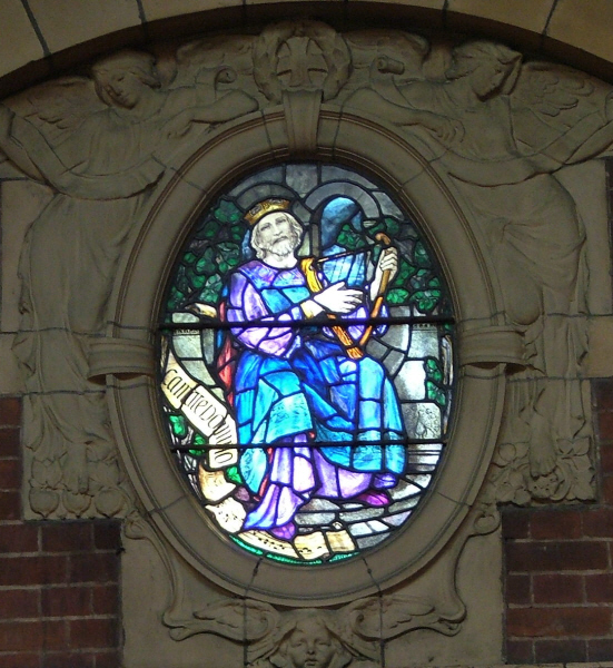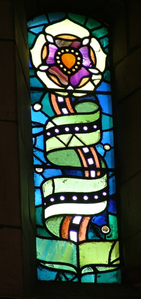 There is an oval stained-glass window about half way down the south aisle wall. It was given in 1936 by the church's organist, Mr D.C. Robertson, in memory of his parents. It carries the inscription "Cantate Domino" - "Sing to the Lord". His brother, Malcolm Duncan Robertson, is commemorated on the War Memorial.