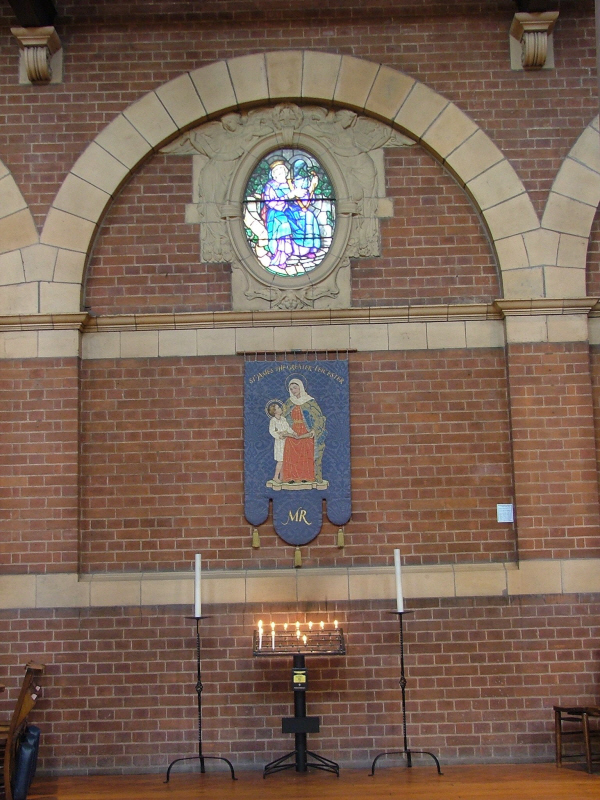 The glass windows in the south wall of the Lady Chapel show differing styles of design. The centre window was designed by Professor Robert Anning Bell, A.R.A. in 1920 and was commissioned by Percy Gee in memory of his wife. The subject of the window is motherhood. The centre panel shows the Blessed Virgin Mary and child and to one side Hannah and Samuel (right) and to the other Elizabeth and St John (left).