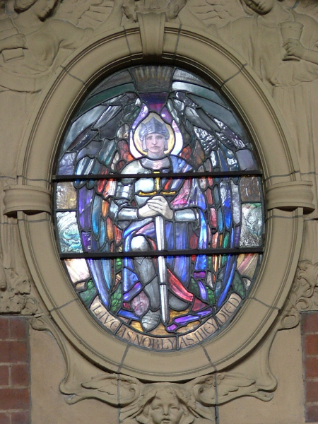 Above is a stained glass window bearing the inscription "Live as nobly as they did", which was erected in 1933 and designed by "a lady in the parish, an artist of distinction"; the peacock tells us who.