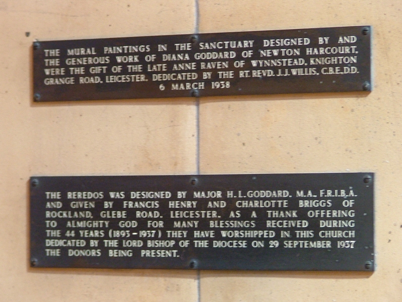 Immediately on your right as you walk down the steps are the two plaques which commemorate the mural painting and the reredos.