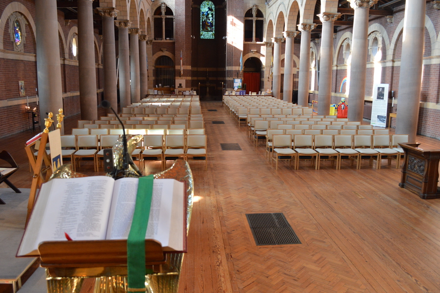 What you see as you look east is a Victorian church, but of a completely different design from any other Victorian church in Leicester. The overall plan of the church is basilican, that is essentially a rectangular shape divided into a wide central space, the nave, with two smaller aisles either side. Torcello is similar in plan. Other similarities include the round headed arches between the nave and aisles. Features which Goddard included, and which he had seen in Italy, are the raised choir and the blue glass-like material used on the choir front and in the apse.
