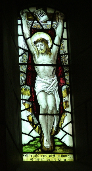 The glass windows in the apse of the Lady Chapel were paid for by the children of the Sunday School, the central one, representing the Crucifixion, carries the inscription "The children's gift in honour of the children's King". They were designed by Robert J Newbury of London.
