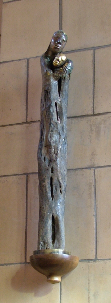 The glass windows in the south wall of the Lady Chapel show differing styles of design. The centre window was designed by Professor Robert Anning Bell, A.R.A. in 1920 and was commissioned by Percy Gee in memory of his wife. The subject of the window is motherhood. The centre panel shows the Blessed Virgin Mary and child and to one side Hannah and Samuel (right) and to the other Elizabeth and St John (left).